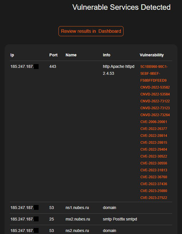 3. Уведомление о найденных новых сервисах и уязвимостях. В отличие от других сервисов сканирования, уведомления приходят на почту клиента NGcloud по мере появления новой информации, а не по жесткому расписанию. Это позволяет не пропустить новые уязвимости, которые легко просмотреть в многостраничных отчетах.