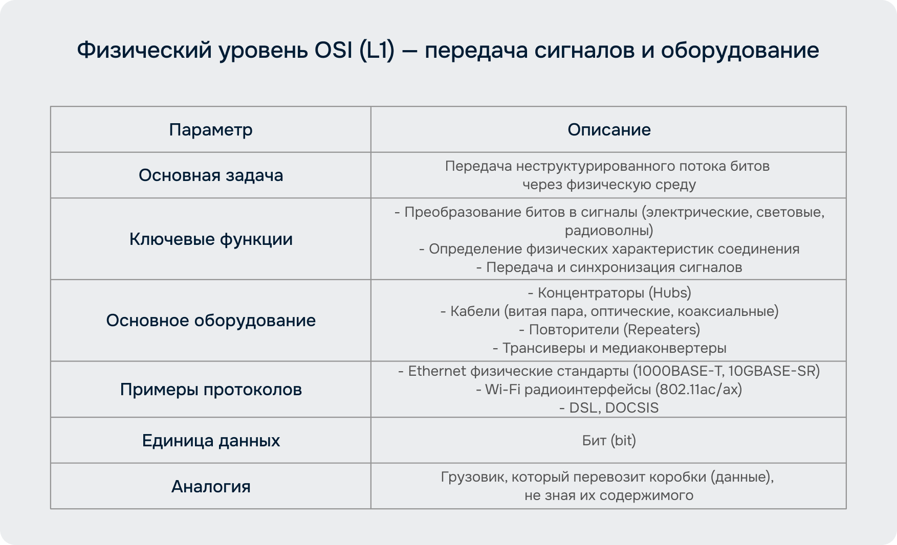 Физический уровень обеспечивает передачу неструктурированного потока битов через среду связи. Он преобразует данные в сигналы: электрические (кабель), световые (оптика) или радиоволны (Wi-Fi). К этому уровню относятся кабели, коннекторы, сетевые адаптеры, повторители и концентраторы (хабы). Устройства L1 лишены интеллекта: концентратор, получив сигнал, транслирует его на все порты. Задача уровня — преобразовать кадр от L2 в последовательность битов/сигналов и отправить в среду. На приёмной стороне происходит обратное преобразование.