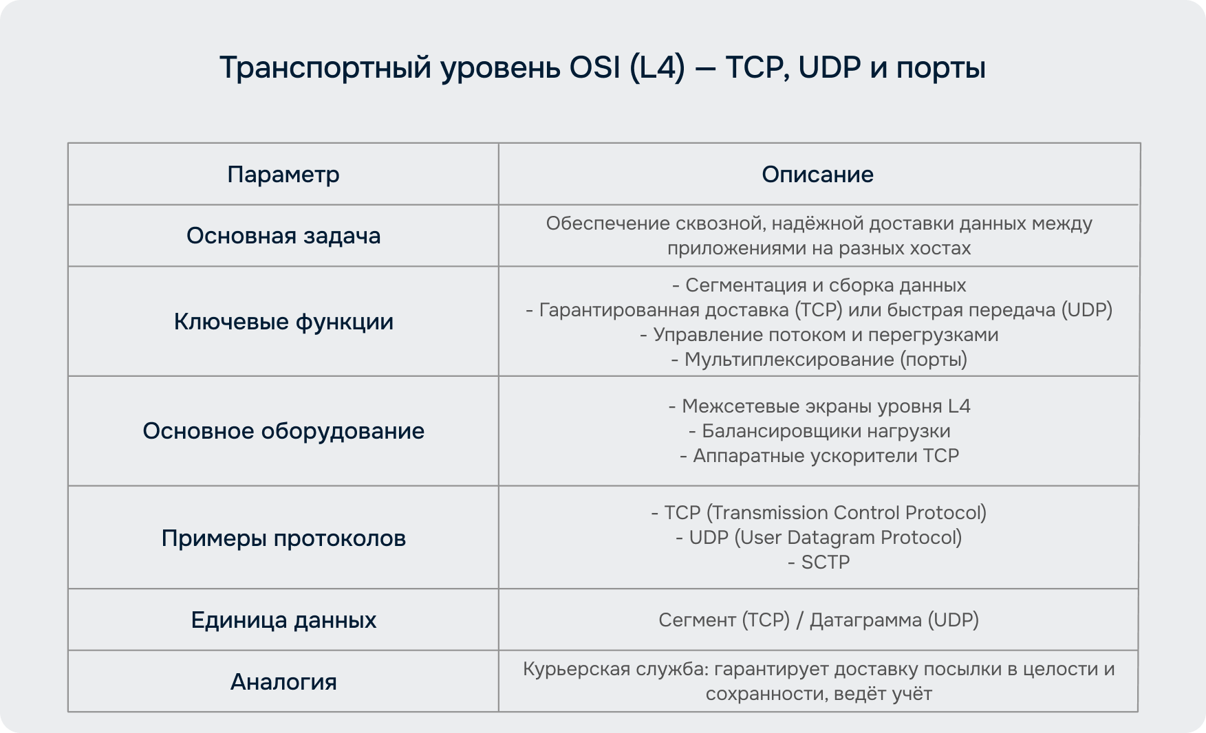 - Транспортный (Transport) соответствует L4 OSI, где на практике решаются задачи сквозной связи. Понимание отличий TCP от UDP здесь критично: первый гарантирует доставку (как в HTTP), второй — скорость (как в VoIP).