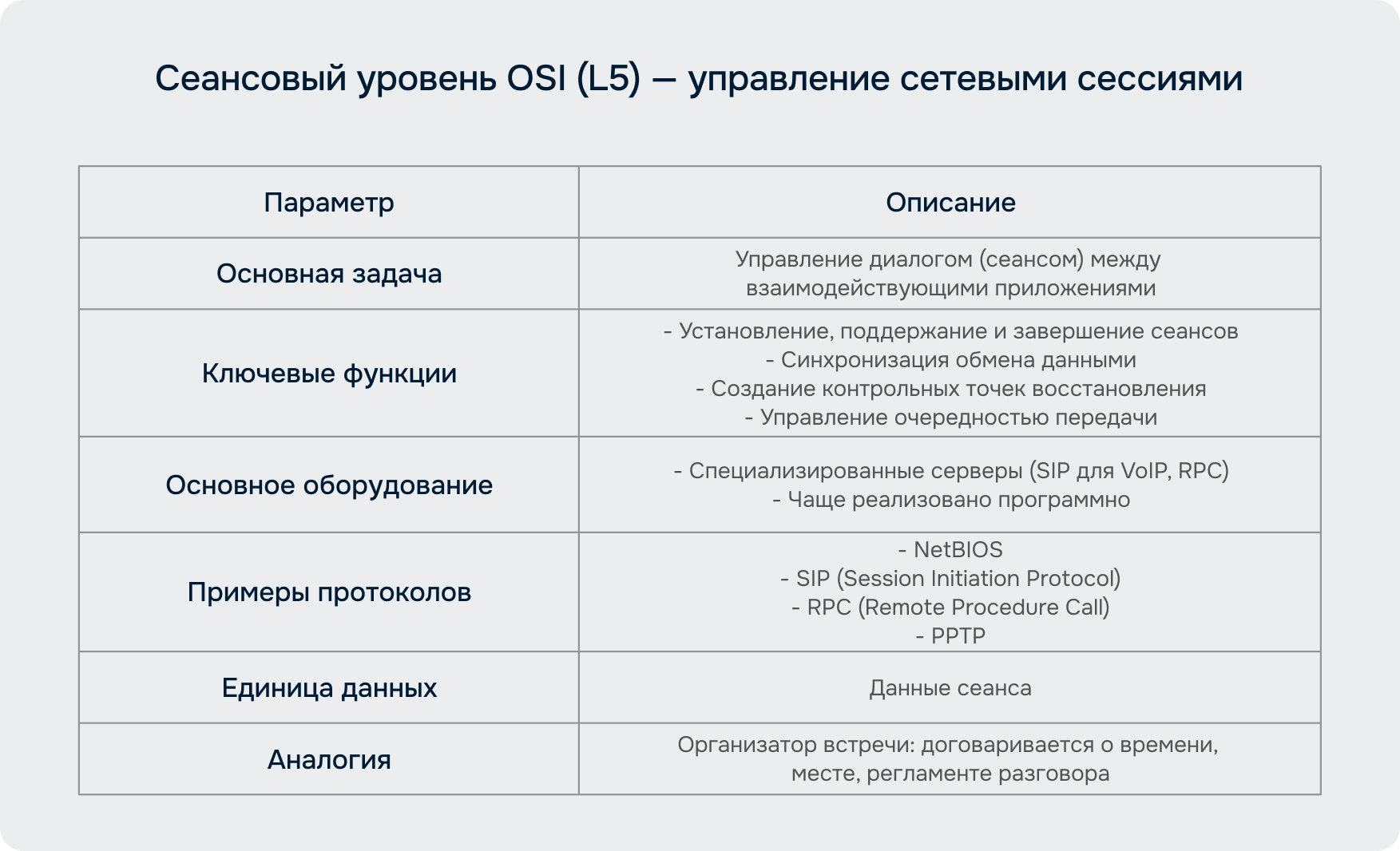 Сеансовый уровень (L5) концептуально отвечает за управление логическим соединением — сеансом — между приложениями. Он описывает механизмы организации диалога, включая порядок обмена данными и режимы взаимодействия (полу- или полнодуплексный).