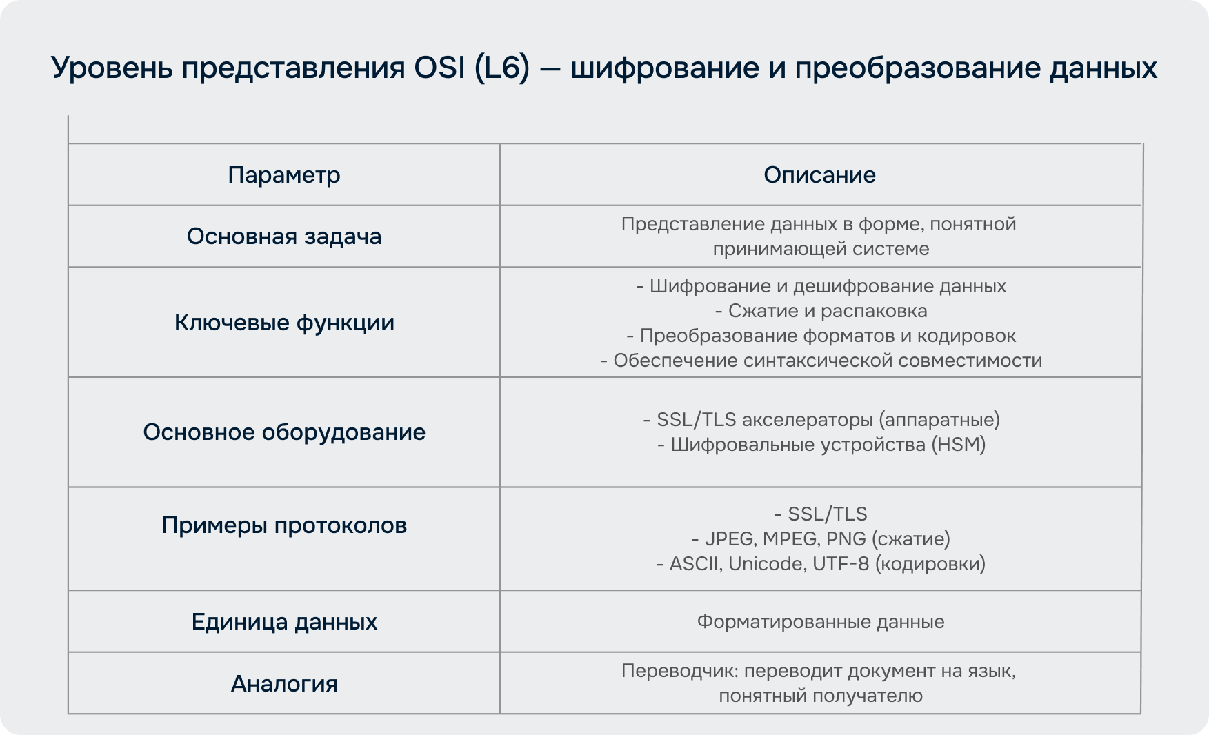 Уровень представления (L6) отвечает за представление данных между различными системами, выступая в роли «переводчика». Он работает с формой и синтаксисом информации, обеспечивая её корректное интерпретирование на принимающей стороне.