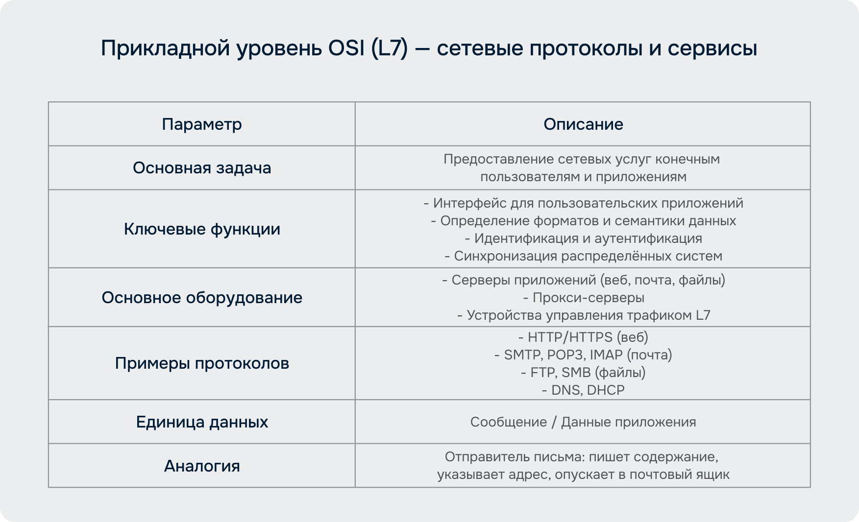 Прикладной уровень (L7) — это интерфейс между пользователем и сетью. Он предоставляет доступ к сетевым сервисам через стандартные протоколы, определяющие правила обмена данными для конкретных задач.