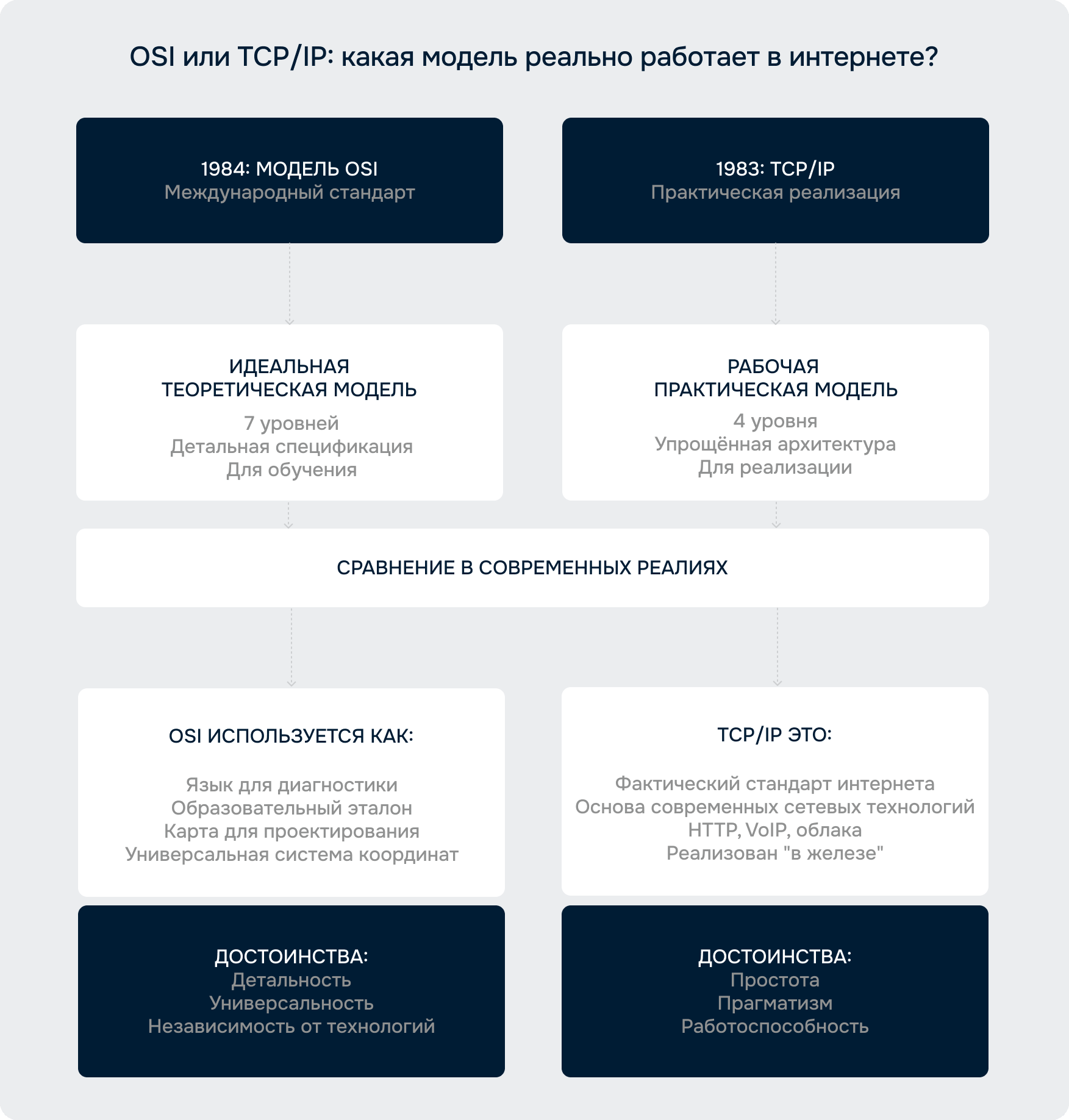 Модели не конкурируют, а дополняют друг друга: TCP/IP — это работающая сеть, а OSI — её понятная карта и диагностический инструмент.