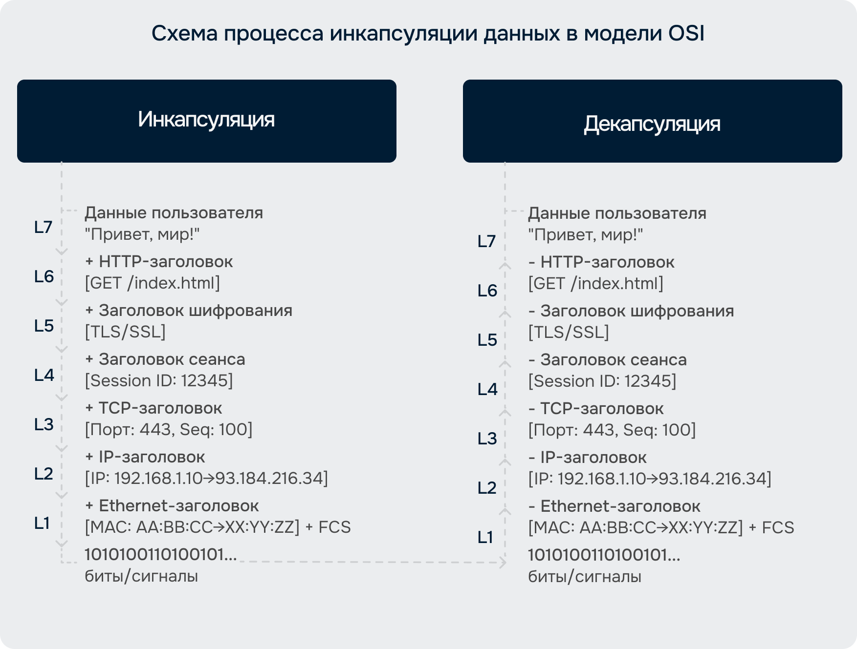 - Инкапсуляция (упаковка): При отправке данные, начиная с прикладного уровня (L7), спускаются вниз. Каждый уровень добавляет к ним свой служебный заголовок, формируя новую структурную единицу. Так информация обрастает инструкциями для доставки.