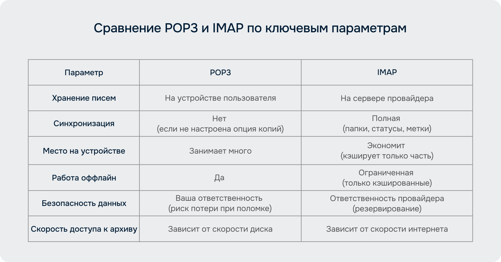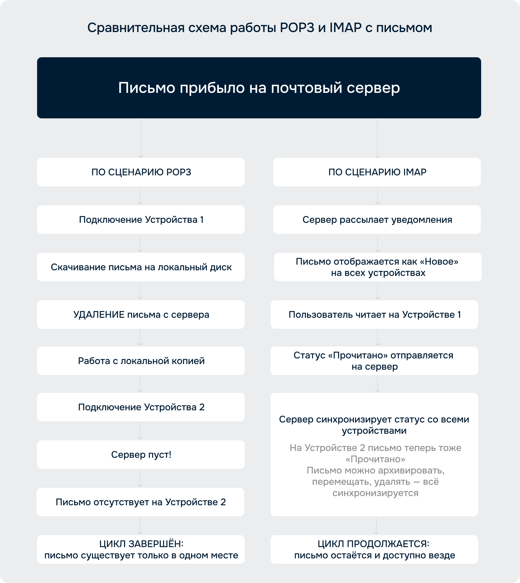 Если резюмировать суть противостояния в одном предложении: POP3 — это про хранение, а IMAP — про доступ. POP3 заботится о том, чтобы письмо навсегда осело в вашей личной цифровой крепости. IMAP обеспечивает, чтобы вы могли мгновенно увидеть и управлять своим архивом из любой точки мира.