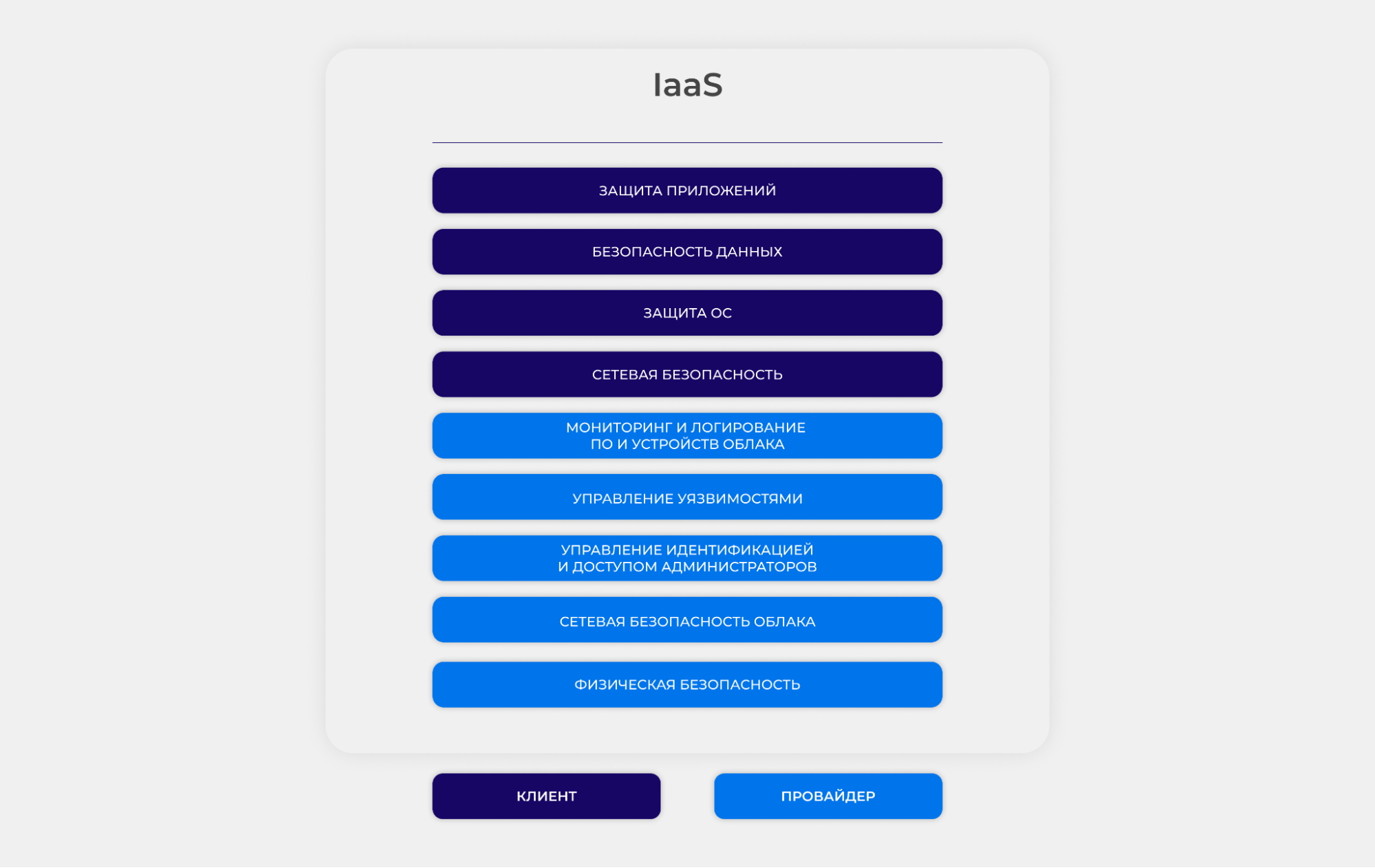 На практике разграничение зон ответственности часто зависит от модели использования облачных платформ (IaaS, PaaS, SaaS). Больше всего обязательств по кибербезу у клиента в IaaS. В этой модели он отвечает за всё, что касается защиты виртуальных машин и их взаимодействия с внешним миром, а также приложений и данных в них.