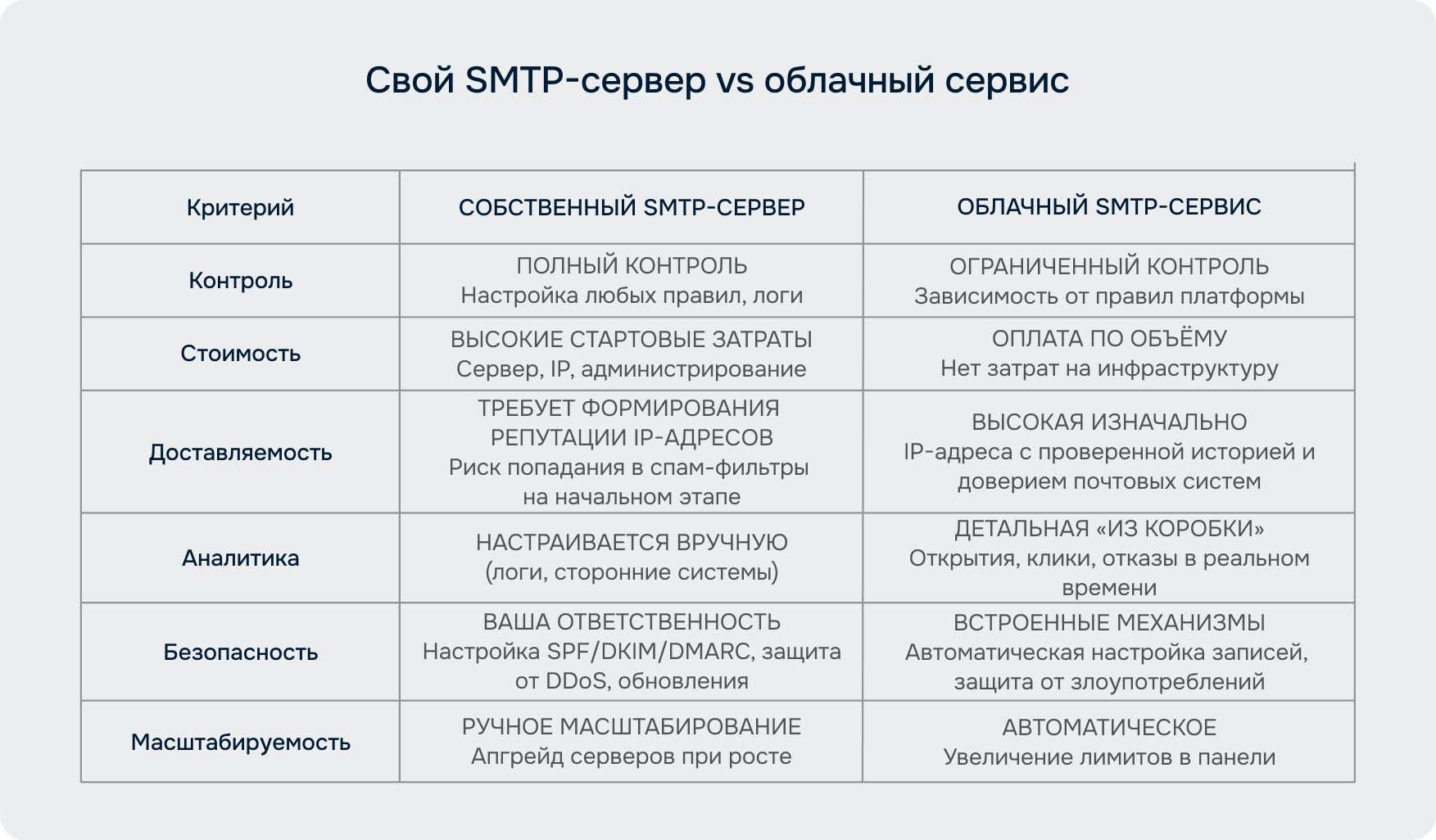 Собственный сервер — выбор для крупных корпораций, государственных организаций и компаний с особыми требованиями к безопасности и хранению данных. Сторонний сервис — оптимальное решение для большинства бизнесов, особенно для маркетинговых и транзакционных рассылок, а также для малых и средних компаний, где критически важны доставляемость и экономия ресурсов.