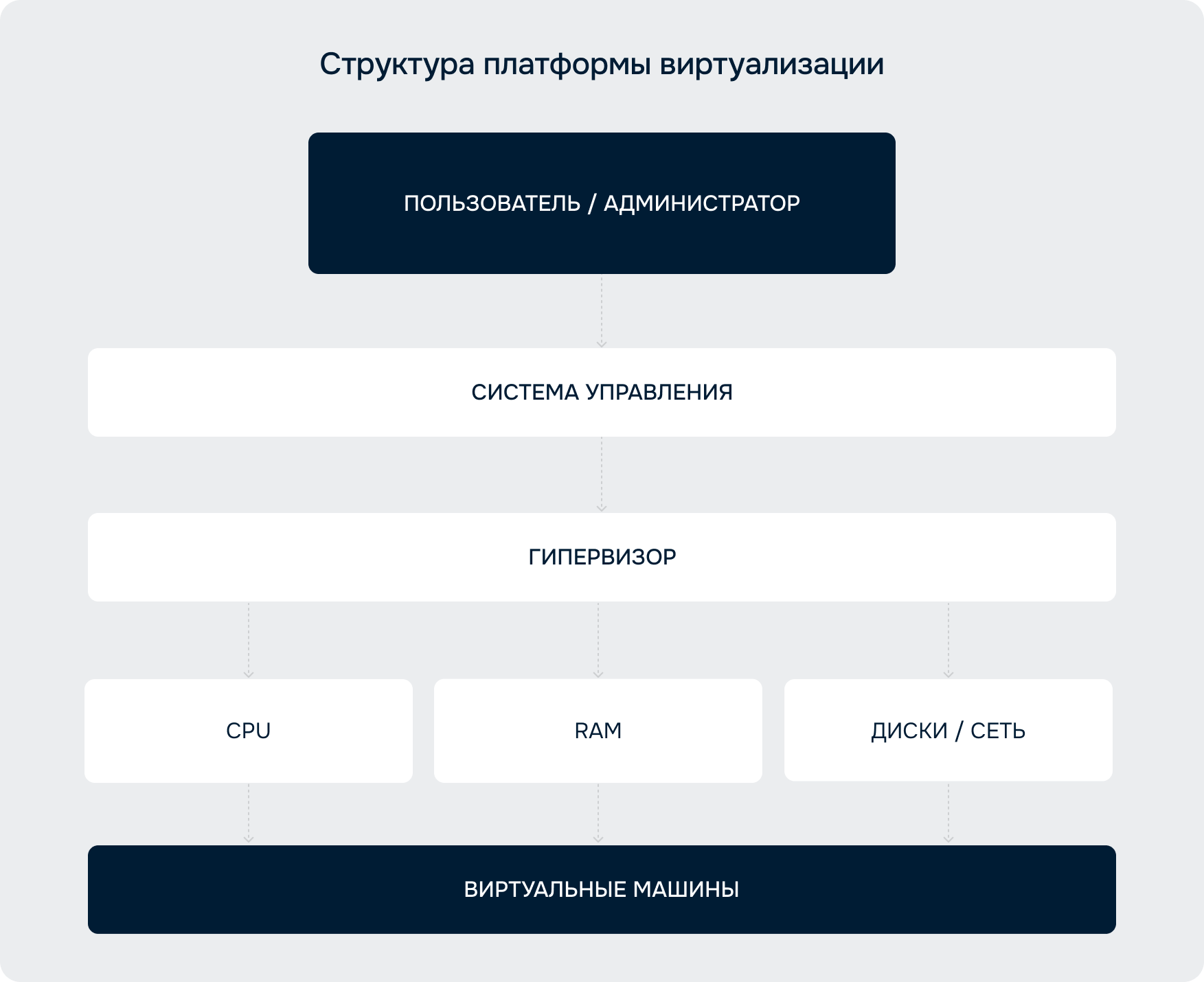 Важно, что гипервизор не управляет операционными системами внутри виртуальных машин — он оперирует ресурсами на уровне инфраструктуры. Все действия внутри гостевых систем (установка ПО, настройка сервисов) выполняются пользователями или средствами автоматизации и находятся вне зоны ответственности платформы виртуализации.