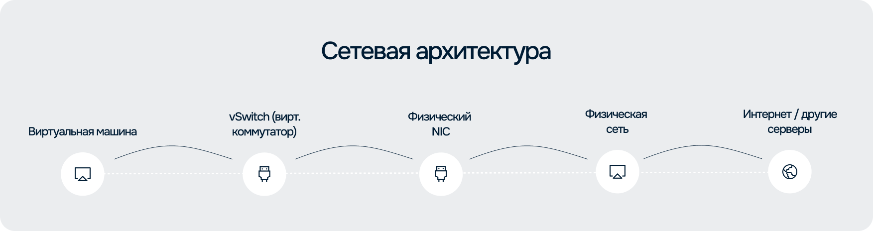 При этом реализация виртуального коммутатора зависит от платформы и может существенно различаться: это может быть встроенный компонент гипервизора или отдельное программное решение (например, Open vSwitch). Независимо от реализации, его задача заключается в обеспечении связности виртуальных машин и интеграции с физической сетью через сетевые интерфейсы хоста.