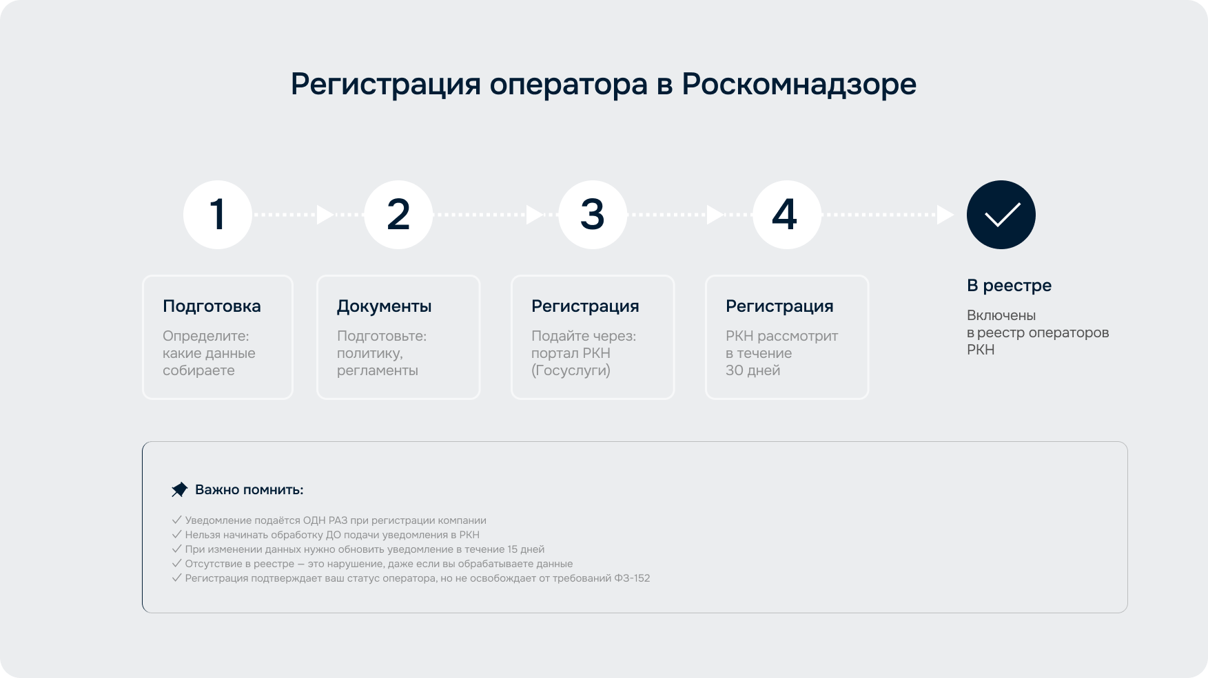 Если вы обрабатываете персональные данные, вы должны зарегистрироваться в Роскомнадзоре. Это нужно сделать один раз при регистрации компании. Вы заполняете форму на сайте РКН: наименование компании, адрес, ФИО руководителя, типы данных, которые вы обрабатываете, описание мер защиты.