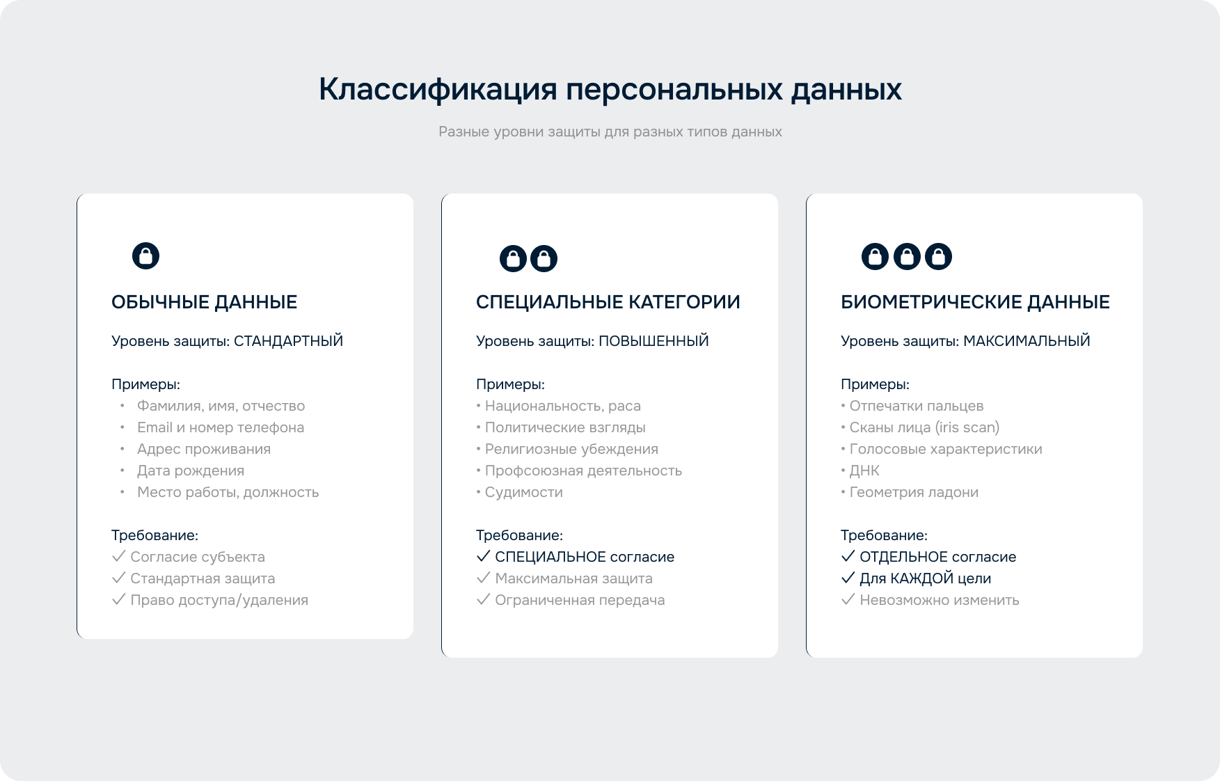 Здесь начинается другой уровень строгости. Если вы собираетесь обрабатывать данные о национальности, расе, этнической принадлежности человека, его политических убеждениях, религии, членстве в профсоюзах, судимостях, это специальные категории персональных данных. Государство очень тщательно охраняет эту информацию, потому что она может привести к дискриминации.