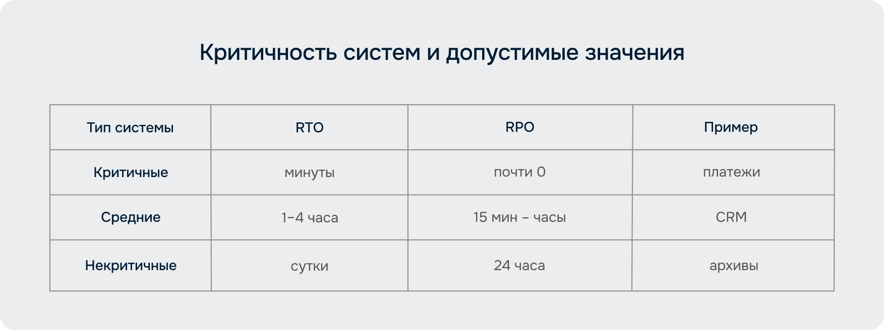 Для систем с низкой критичностью допускаются более высокие значения RTO и RPO.