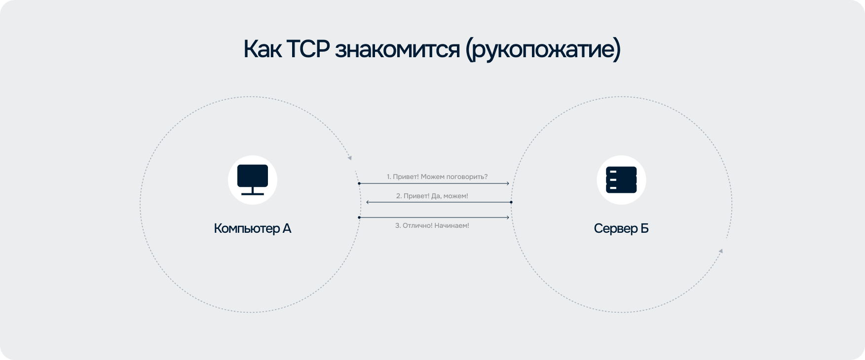 TCP устанавливает соединение через так называемое «трёхстороннее рукопожатие». Отправитель формирует служебный пакет, получатель отвечает подтверждением, а затем ещё один пакет закрывает цикл. В результате создаётся устойчивое соединение — канал, в котором данные пересылаются безопасно.